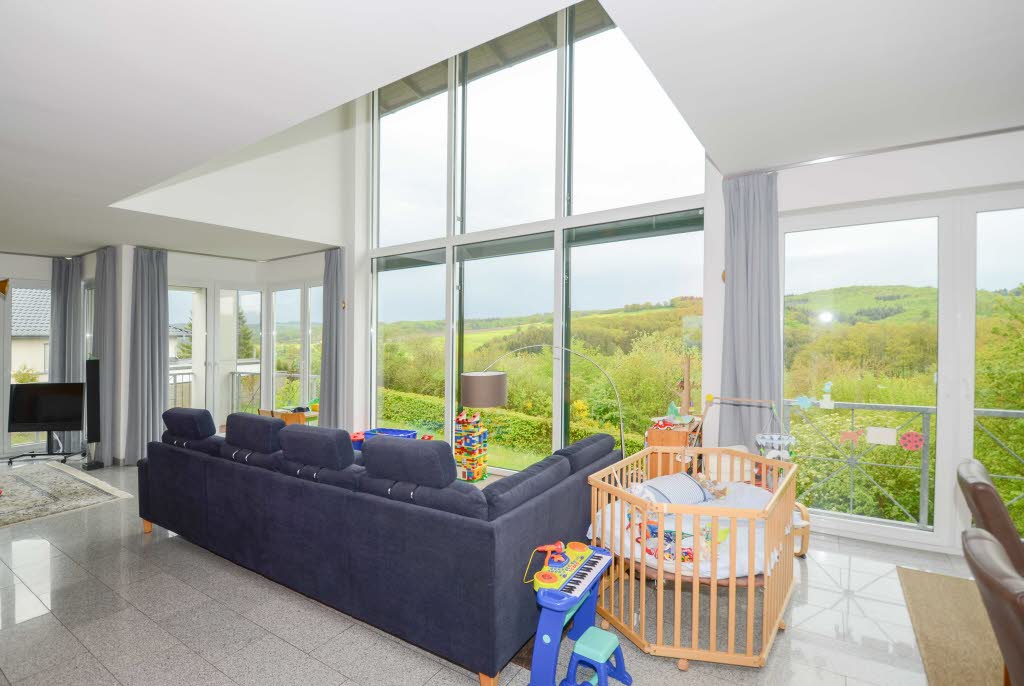 Eifelvilla in grandioser Panorama-Aussichtslage, in einem Ortsteil von Bad Münstereifel, Baujahr 2002, Wohnfläche 292 m², 8 Zimmer, inkl. separatem Büro/Praxisbereich im Erdgeschoss und separater Einliegermöglichkeit im Garten- / Hanggeschoss, 2 moderne, großzügige Tageslichtbäder, Gäste-WC, 16.515 m² Südgrundstück in besonders reizvoller Lage, Einbauküche, Specksteinofen, Gas-Zentralheizung / Fußbodenheizung, Granit- und Parkettböden, fantastische Sichtachsen mit unverbaubarem Blick in die Eifellandschaft von fast allen Räumen, Garage, 4 Pkw-Stellplätze, alles nach Feng Shui geplant und gebaut