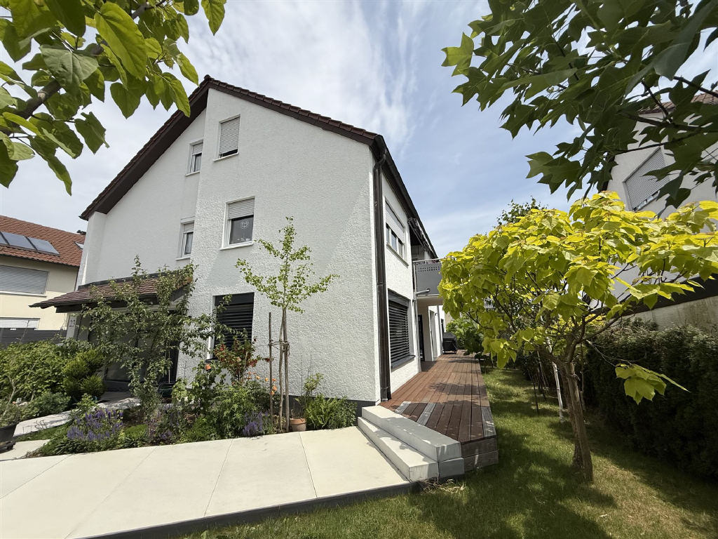 Die große und abwechslungsreich gestaltete Terrasse mit Garten bietet gleich mehrere Sitzgelegenheiten und Möglichkeiten der Entspannung mit Blick ins Grüne.