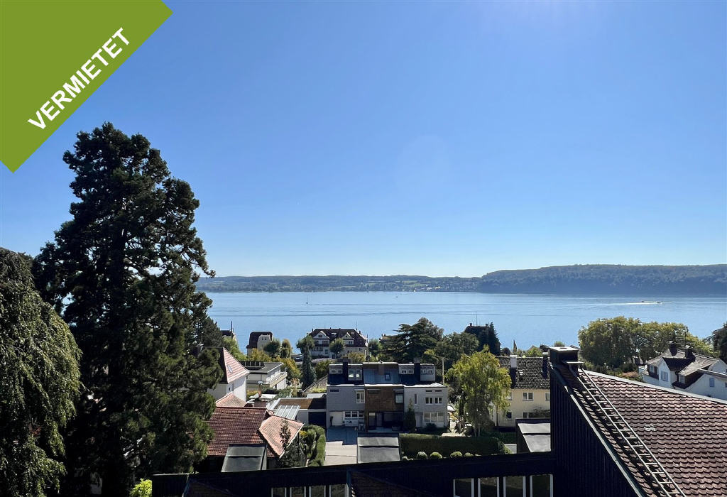 VERMIETET! Hier dürfen wir Ihnen eine 3,5 Zimmer-Maisonette-Wohnung in einer der begehrtesten Lagen mit absoluter Traumseesicht in Überlingen zur Miete anbieten. Nur wenige Gehminuten trennen Sie vom Bodenseeufer und vom Westbad, welches ausgelassene Badefreuden im Sommer garantiert und von der historischen Altstadt Überlingens mit dem weitläufigen Bodenseeufer, das zum Flanieren einlädt. Gleichzeitig ist Ihr Zuhause ruhig und in einer parkähnlichen Anlage gelegen. Doch sehen Sie sich die Wohnung einmal an. Über ein Treppenhaus gelangen Sie in Ihre Maisonette-Wohnung, die offen und luftig gestaltet ist. Ein geräumiger Flurbereich mit genügend Platz für eine Garderobe führt direkt in den wunderbar großen Wohn-/Ess- und Küchenbereich. Alle Wohnräume sind mit einem hochwertigen Vinylboden ausgelegt. Für optimalen Lichteinfall ist im Wohn-/Essbereich eine bodentiefe Fensterfront verbaut worden. Von hier aus gelangen Sie auch auf den traumhaft eingebetteten Sonnenbalkon mit idealer Südausrichtung und herrlichem Blick auf den See. Ein modernes Tageslichtbad mit bodengleicher, übergroßer Dusche, WC, Waschbecken und Handtuchheizkörper ergänzt die Etage. Über eine Wendeltreppe gelangen Sie in das obere Geschoss Ihrer Wohnung. Hier empfängt Sie eine Galerie, von der aus Sie nach unten in den Wohn-/Essbereich blicken können. Zwei Schlafzimmer, von denen Sie ebenfalls einen traumhaften Blick auf den See haben, komplettieren die zauberhafte Wohnung. Im Untergeschoss des Hauses steht Ihnen ein Kellerraum zur Verfügung. Für Ihr Fahrzeug befindet sich in einem separaten Gebäude ein Garagenstellplatz. Ein Traum, hier zu wohnen!