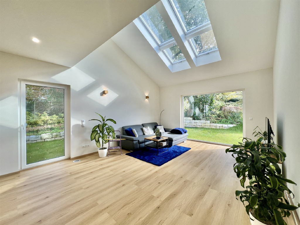 Hier dürfen wir Ihnen eine Immobilie anbieten, bei der wirklich alles stimmt. Angefangen beim taufrischen Baujahr, in dem das moderne Einfamilienhaus erbaut wurde, die moderne und stylische Ausführung des Gebäudes, die herrliche Südterrasse mit dem sich anschließenden großen, ebenen Grundstück und weiter über die technische Gebäudeausstattung, die sich auf modernstem Niveau befindet. Zahlreiche bodentiefe Fensterfronten, ein toller großer und offener Wohn-/Essbereich mit einer superschicken Einbauküche lassen das Herz des anspruchsvollen Immobilieninteressenten höher schlagen. Doch treten Sie mit uns ein und sehen Sie selbst: Der ebenerdige Eingangsbereich ist hell und freundlich und verspricht absolutes Wohlbefinden und Platz. Neben dem Duschbad lassen sich eine große Familiengarderobe und eine Sitzbank problemlos unterbringen. Links gelangen Sie in den offenen Wohn- /Ess- und Küchenbereich, das Herzstück der Immobilie und Treffpunkt für die ganze Familie. Hier wird bei modernstem Ambiente zusammen gekocht, gegessen, geredet und anschließend auf der Wohnlounge gechillt. Auch hier wurden ausschließlich bodentiefe Fenster verbaut, so dass dieser herrlich große Raum lichtdurchflutet ist. Besonders das große Fenster in den Himmel hinaus verzaubert mit seinem Ambiente und zieht nicht nur den „Sternengucker“ in seinen Bann. Von hier aus haben Sie auch Zutritt auf die bereits erwähnte sehr große, nach Süden ausgerichtete Terrasse und den ebenerdigen Garten. Ebenfalls auf dieser Ebene befindet sich der Technikraum und eine praktische Speisekammer. In das Obergeschoss gelangen Sie über eine schöne Holztreppe mit integrierter Beleuchtung. Hier erwarten Sie drei Schlafzimmer, eine Ankleide, ein Büro sowie ein Tageslicht-Badezimmer. Für Ihre Fahrzeuge stehen Ihnen mehrere Stellplätze zur Verfügung. Darüberhinaus ist eine Baugenehmigung für eine Doppelgarage vorhanden.