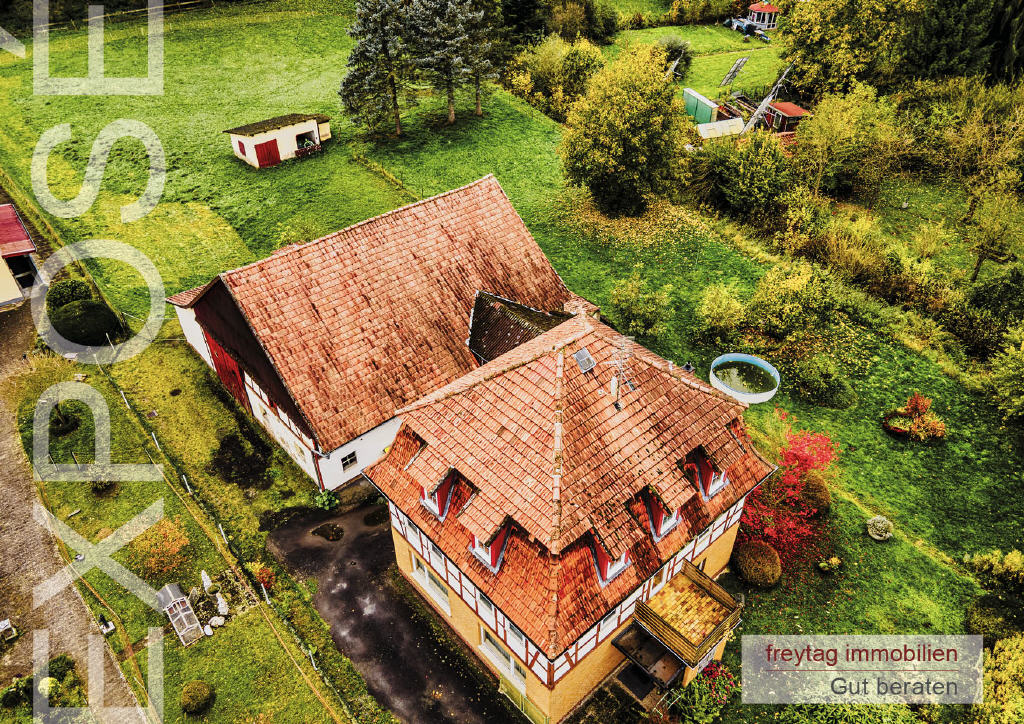 Im Mittelpunkt dieses Anwesens steht ein großzügiges Wohnhaus mit Geschichte. Errichtet im Stil der 1920er Jahre in traditioneller Fachwerkbauweise, wurde es 1970 substantiell erweitert: Das Erdgeschoss erhielt ein massives Fundament, und der Eingangsbereich wurde mit einem überdachten Vorbau ergänzt – dessen Dach dient seither als Balkon mit Blick ins Grüne.