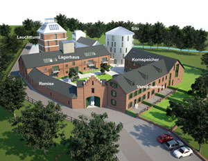 Insgesamt besteht die historische Gutshofanlage aus 7 Gebäuden in aufgelockerter ringförmiger Anordnung mit einem begrünten Innenhof. Selbstverständlich stehen komfortable Aufzüge (Silo und Leuchtturm) bereit.
