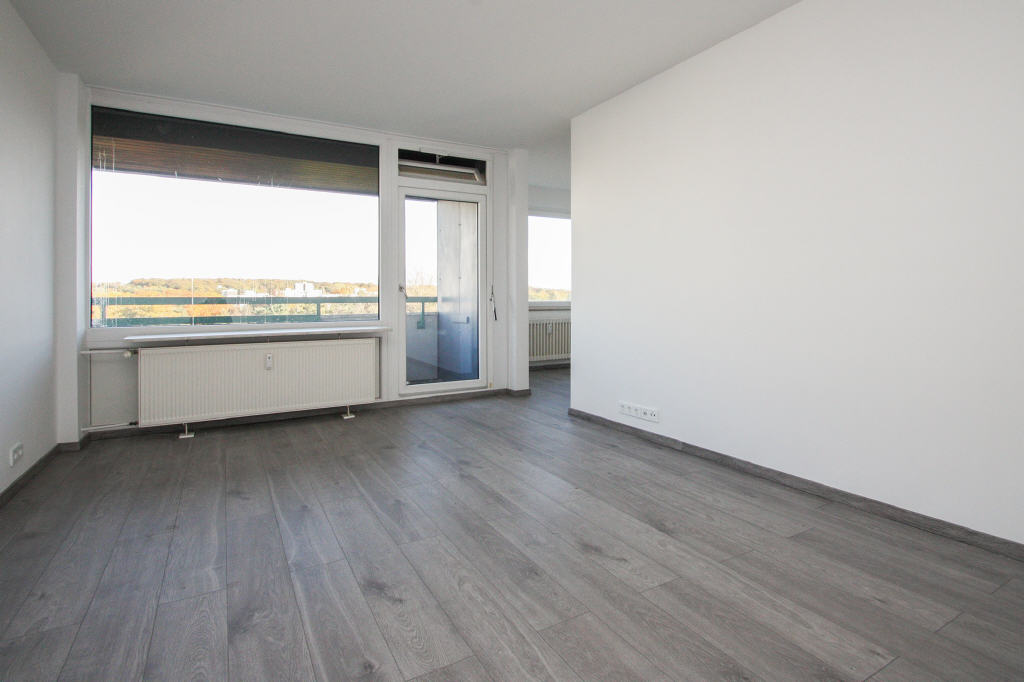 Die helle Wohnung liegt auf der neunten Etage eines gepflegten Mehrfamilienhauses – natürlich mit Aufzug. Hier genießen Sie die Aussicht über den grünen Stadtweiher bis hin zum Hildener Wald.
