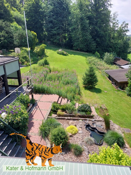 Ein dem Elternschlafzimmer vorgelagerter, überdachter Balkon gewährt freien Blick in den Garten, dem Waldesrand mit seinen kleinem Bachlauf.