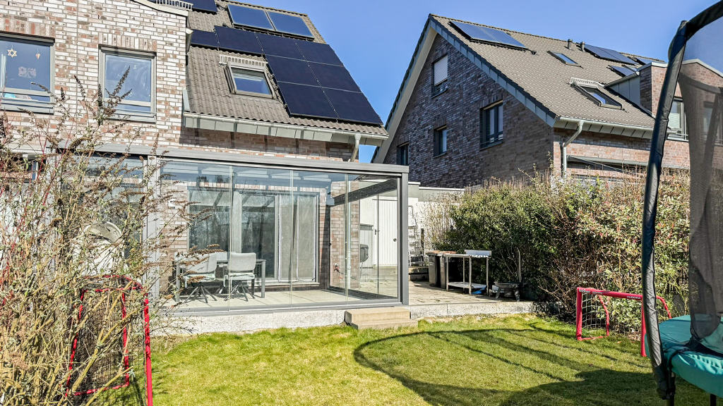 Der pflegeleicht angelegte Garten mit Wintergarten lädt zu Grillpartys mit der ganzen Familie ein – auch bei wechselhaftem Wetter.