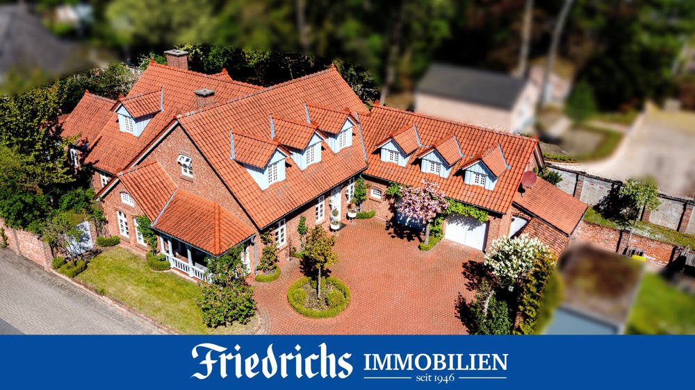 Dieses außergewöhnliche Anwesen vereint auf eine sehr ansprechende und ästhetische Art diverse Stilrichtungen - die Bauweise in Verbindung mit der Gartengestaltung erinnert mit ihren vielen Giebeln und pittoresken Sprossenfenstern an ein malerisches, englisches Cottage, während sich im Inneren des Hauses viele typisch norddeutsche, historische Elemente wie Eichenholz-Parkett und massives Ständerwerk, stilvolle Kassettentüren mit Ornamentverglasung sowie Speckstein-Ofen und gemauerter Kamin mit einem modernen Einrichtungsstil gekonnt vermischen. Die an den Wohnbereich angrenzende Veranda ähnelt wiederum dem geschmackvollen, besonders schönen Stil der bekannten amerikanischen Südstaatenhäuser und fügt sich ansprechend und einladend in das Ensemble ein. Eine massiv errichtete Doppelgarage mit Fahrrad-Geräteraum sowie ein Nebengebäude mit Werkstatt und Abstellraum sind zwei von vielen weiteren Extras.