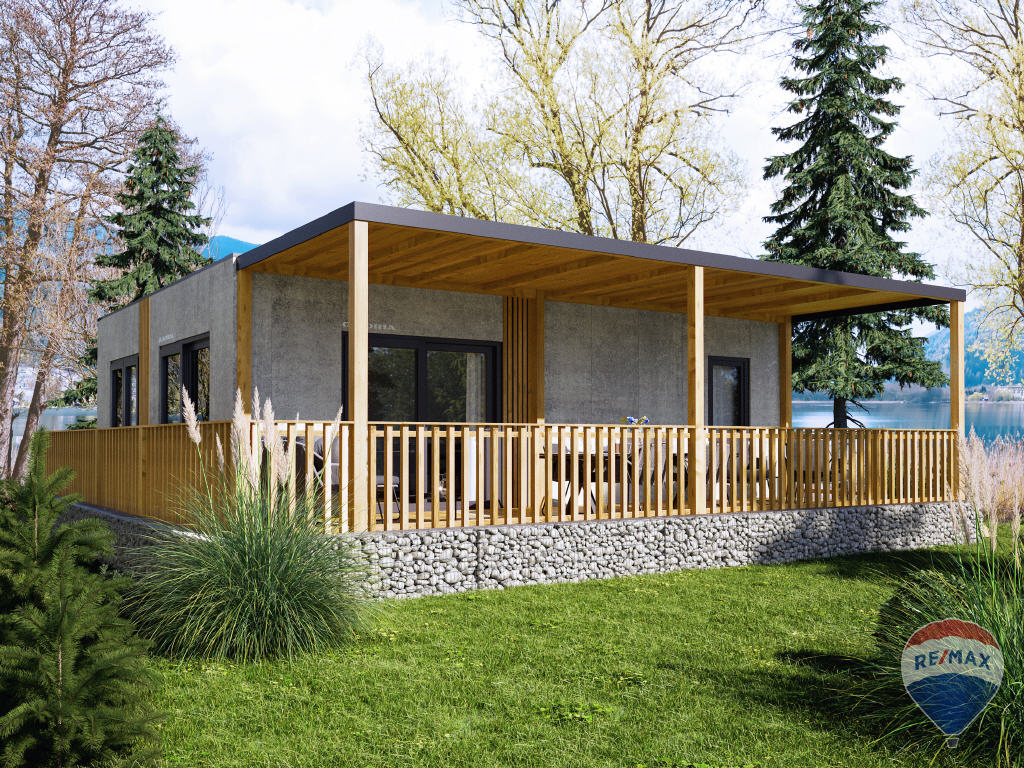 Durch die großen Schiebetüren gelangen Sie direkt aus dem hellen Wohnbereich auf die umlaufende Terrasse aus imprägniertem Kiefernholz. Hier genießen Sie einen beeindruckenden Ausblick über den Ossiacher See und die umliegenden Bergflanken. Das passende Geländer und das Tor runden das Gesamtbild stilvoll ab.