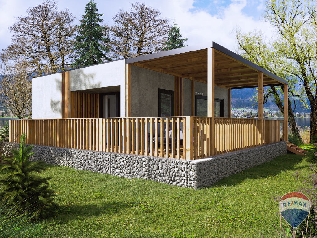 Dank der Schiebetüren gelangen Sie direkt aus dem hellen Wohnbereich auf die großzügige, umlaufende Terrasse. Diese ist aus imprägniertem Kiefernholz gefertigt – ebenso wie das dazu passende Geländer – und bietet einen atemberaubenden Blick über den Ossiacher See und die umliegenden Bergflanken. Die große Überdachung sorgt dafür, dass Sie hier in jeder Jahreszeit geschützt sitzen und genießen können.