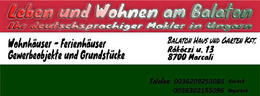 Ihr deutsch sprachiger Makler in Süd/West Ungarn am Balaton. Immobilien - Häuser - Ferienhäuser - Gewerbeobjekte - Grundstücke Balaton - Plattensee - Süd-Balaton - West-Balaton - Nord-Balaton Der in Westungarn liegende Balaton (deutsch Plattensee) ist der größte Binnensee und der bedeutendste Steppensee Mitteleuropas. Er ist 79 km lang und im Mittel 7,8 km breit.