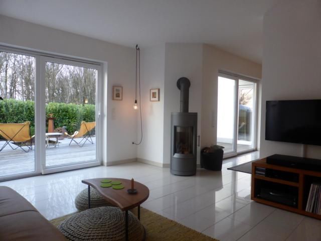 In der Übergangszeit verbreitet ein schwenkbarer gußeiserner Kaminofen der Fa. Hase angenehm wohlige Wärme in dem ca. 34 m² großen schön aufgeteilten Wohn- und Essbereich (optisch unterteilt durch eine Mauerscheibe).