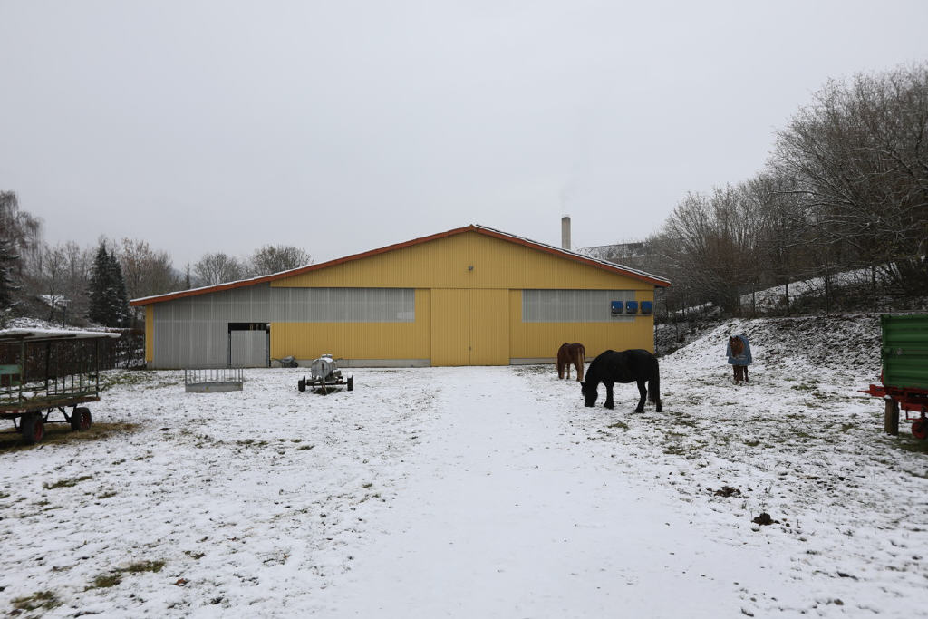 Die Reithalle wurde aus einer Stahlträger-/Holzkonstruktion gefertigt. Ein großes zwei-flügliges Stahltor aus Trapezblech ermöglicht einen hervorragenden Zugang zur Halle.
