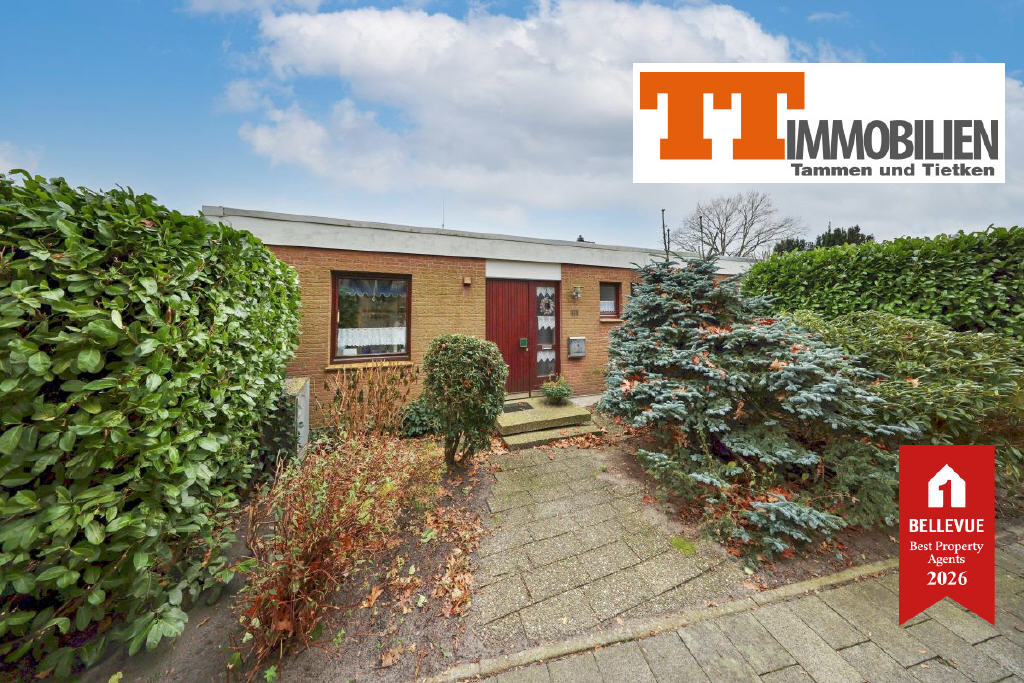 Ebenerdiges Wohnen im beliebten Wiesenhof; eingebettet in eine angenehm grüne Umgebung und umgeben von gewachsenem Baumbestand, präsentiert sich dieses Reihenendhaus aus dem Jahr 1970 als ein Zuhause mit wunderbar ruhiger Ausstrahlung und zugleich viel Raum für moderne Wohnideen. Auf einem 325 m² großen Grundstück bietet das Haus rund 103 m² Wohnfläche, verteilt auf 5 Zimmer. Bereits der Windfang mit Gäste-WC öffnet sich zur zentral gelegenen Diele, die heute als Esszimmer genutzt wird und mit ihrer Terrassentür den Blick in den Garten freigibt. Von hier aus gelangt man sowohl in die Küche mit angrenzendem Vorratsraum als auch in das großzügige Wohnzimmer. Der Wohnbereich wird durch seine breite Fensterfront geprägt, die viel Licht einfängt und den Blick in den geschützten Garten lenkt. Ein Kamin bildet den gemütlichen Mittelpunkt dieses Raumes und schafft eine einladende Atmosphäre. Direkt am Wohnzimmer befindet sich ein weiterer Raum, der zuletzt als Büro diente und sich dafür auch hervorragend eignet. Die Küche ist hell, funktional und verfügt dank des Vorratsraumes über zusätzliche Stellfläche, die sich im Alltag als äußerst praktisch erweist. Über den Flur erschließen sich drei weitere Zimmer, die flexibel nutzbar sind: z. B. als Schlafräume oder zusätzliche Arbeits- oder Hobbyzimmer. Das Badezimmer mit Fenster ist mit Dusche und Waschbecken ausgestattet und bietet eine solide Basis für eine moderne Neugestaltung. Besonders reizvoll ist der eingewachsene, von außen nicht einsehbare Garten, der dem Haus eine wohltuend private Atmosphäre verleiht. Die nach Westen ausgerichtete Terrasse lädt mit ihrer neuwertigen Markise zum Entspannen ein. Eine praktische Gartentür führt zusätzlich in den Außenbereich. Ergänzt wird das Raumangebot durch einen von außen zugänglichen Teilkeller, der Platz für die Heizungsanlage, eine Werkstatt und Gerätschaften bietet. Eine Garage befindet sich in unmittelbarer und fußläufiger Nähe und rundet das Angebot ab. Dieses Reihenendhaus ist ein Wohnort mit Charakter – ein solides Fundament, das auf eine Renovierung, neue Farben und frische Ideen wartet. Wer den Wiesenhof mit seiner grünen, harmonischen Umgebung schätzt und ein Zuhause mit viel Potenzial sucht, findet hier eine besondere Gelegenheit.