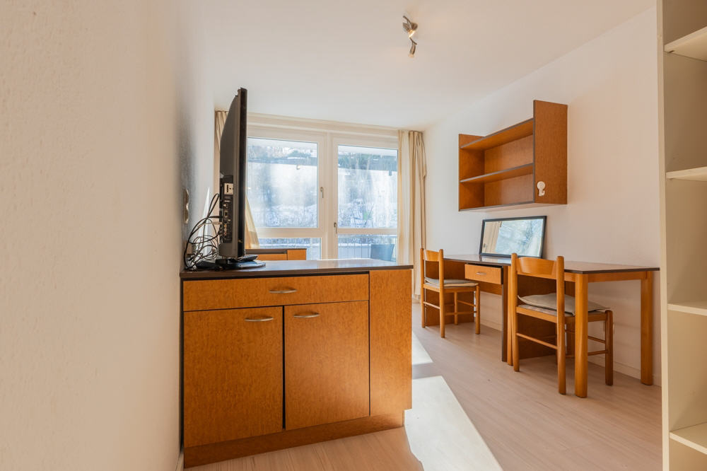Das gegenständliche Appartement liegt im Dachgeschoss einer Anfang der 90er Jahre erstellten Studentenwohnanlage. Durch die rechteckige Raumaufteilung ergeben sich gute Stellflächen und eine optimale Raumausnutzung. Das Appartement ist voll möbliert und mit einem Duschbad und einer eingebauten Kochzeile, sowie einem Balkon ausgestattet. Zwei Fensterelemente sorgen für eine ausreichende Belichtung.