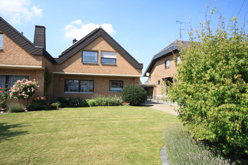 Rechts seitlich am Haus steht die gleichfalls verklinkerte Doppelgarage in Längsrichtung (11 Meter).