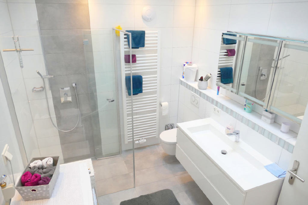 Das lichtdurchflutete Badezimmer beeindruckt durch eine Deckenhöhe von über 4 Metern. Die bodengleiche Dusche, die Badewanne und das große Waschbecken sind geschmackvoll aufeinander abgestimmt. Zusätzlichen finden Sie die Möglichkeit hier auch Ihre Waschmaschine anzuschließen.