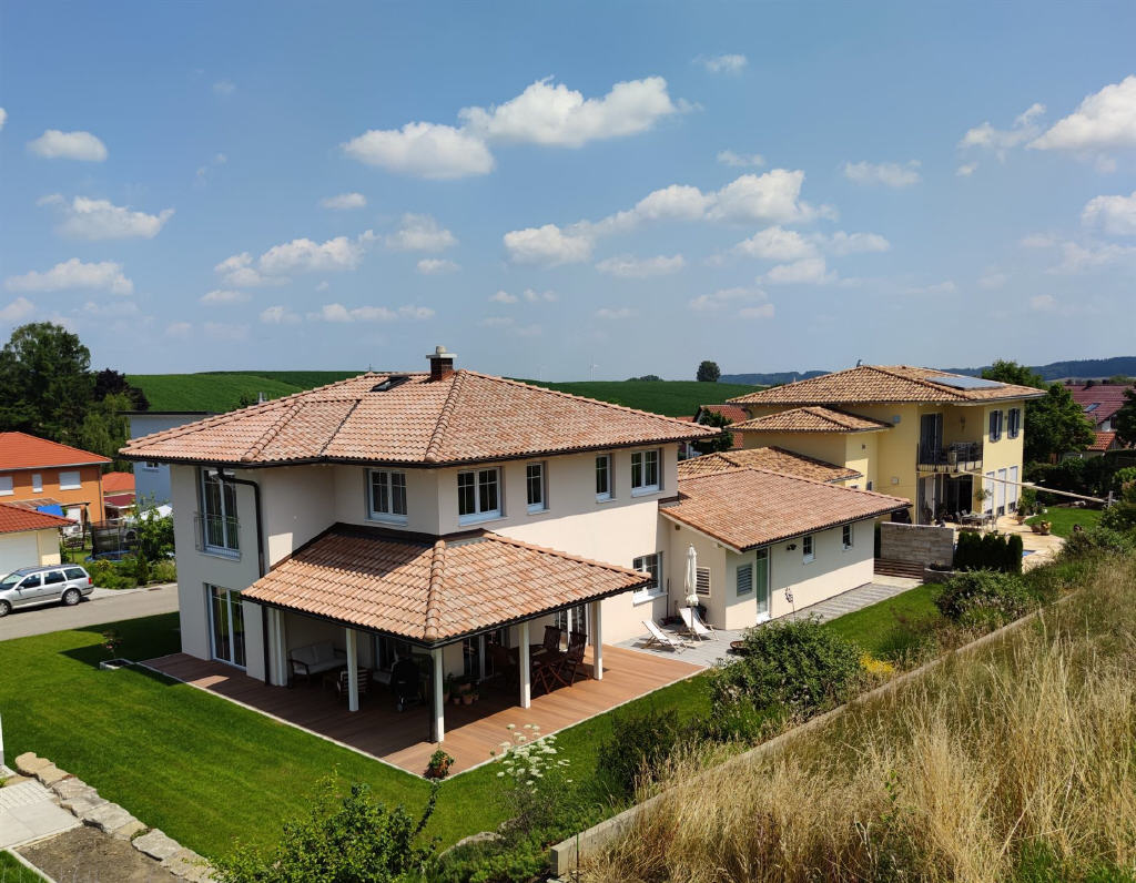 Die große Süd-Terrasse ist fast von jedem Zimmer im Erdgeschoss aus begehbar und lädt durch die Überdachung, bei fast jeder Wetterlage ein, an der frischen Luft zu verweilen. Eine vom Fachmann erstellte Natursteinmauer (ca. 60.000€) auf der Südseite verstärkt den Toskana Flair und schützt vor Einblicken und Erosion. Der Terrassenboden (WPC und Betondielen in Holzoptik) auf der Südseite wurde im Frühjahr 2021 für ca. 40.000,- € fertig gestellt. Die komplette Außenanlage der Villa hatte Herstellungskosten von über 200.000€ und wurde in allen Gewerken von Fachfirmen ausgeführt. Die Qualität lässt sich in der Nutzbarkeit, den Details und vor allem auch schon jetzt in der Langlebigkeit erkennen.