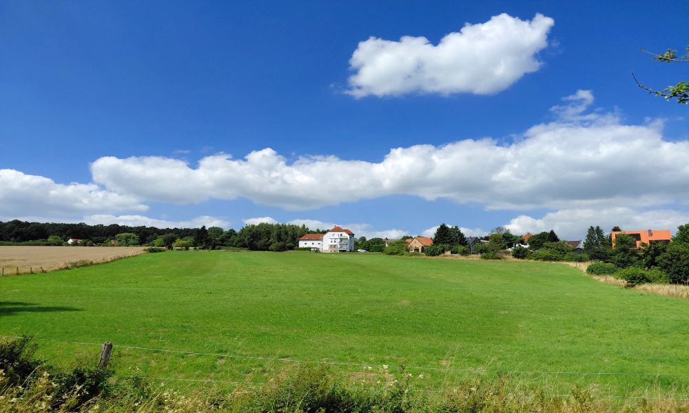 Das Grundstück befindet sich etwas unterhalb des Straßenniveaus und wäre über die Nordostecke von der Straße aus zu befahren. Auf einem ca. 45 Meter tiefen Streifen längs der Straße (ca. 4.500 m²) besteht die Möglichkeit der Bebauung nach § 34 BauGB (Nachbarschaftsbebauung). Denkbar ist eine Bebauung mit Ein- und/oder Mehrfamilienhäusern. Auch eine Bebauung mit einer Senioren- oder Pflegeeinrichtung ist vorstellbar.