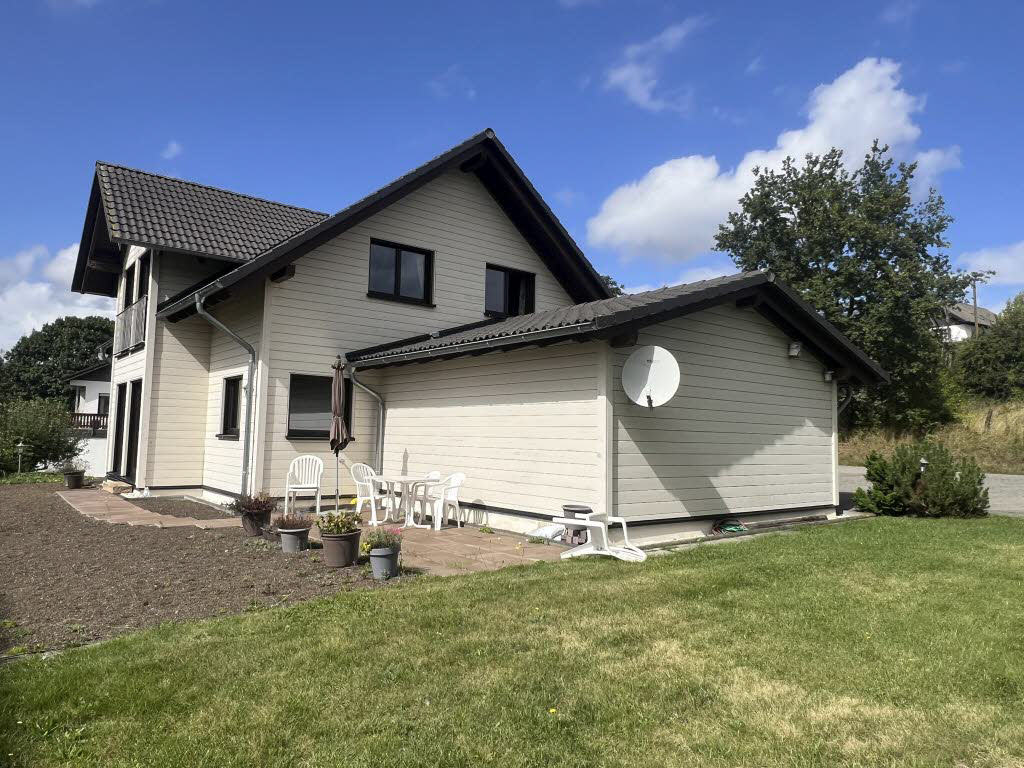 In traumhafter Aussichtslage von Nümbrecht, Ortsteil, gelegenes Holzhaus der Firma Stommel, Baujahr 2014, EG mit großem Wohn-Essbereich, Küche, Duschbad, OG mit 3 Zimmern und geräumigem Duschbad, Wohnfläche 141 m², moderne Technik, Fußbodenheizung mit Wärmepumpe, Doppelgarage, Grundstück ca. 750 m² in Süd-Westausrichtung, Kaufpreis: € 395.000