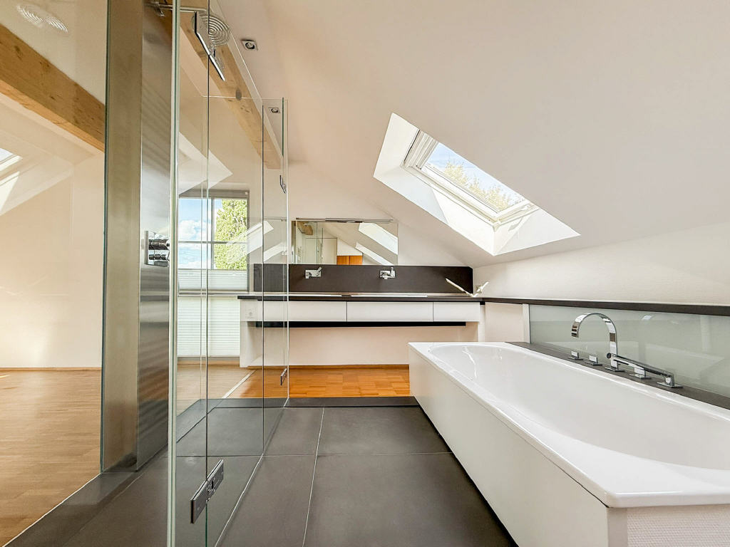Ein echtes Highlight ist das Dachgeschoss. Ein luxuriöser Schlafraum mit begehbarem Kleiderschrank und offen gestaltetem Natursteinbad bietet höchsten Komfort. Maßgeschneiderte Einbauten fügen sich harmonisch in die Dachschrägen ein.