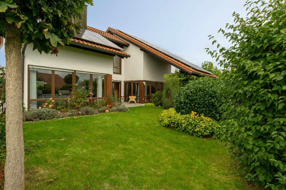 880 m² Grund. Der Garten ist ein echtes Kleinod – wunderbar angelegt und pflegeleicht. Der Garten wurde von einem Garten Architekten geplant in Zusammenarbeit mit einer Fengshui Expertin geplant.Es gibt viele Ecken zum Sitzen und Aufhalten. so kann man entscheiden, ob man lieber im Schatten oder in der Sonne sitzt. Die Terrasse ist teilweise überdacht, hier können Sie Ihre Gartenmöbel bei jedem Wetter stehen lassen. Zur Straße hin befindet sich eine Hecke als Blickschutz. Es gibt allerhand Zierpflanzen und auch Obstbäume, sowie eine schöne Rasenfläche. Der Hauszugang, die Garageneinfahrt und die Terrasse sind befestigt.