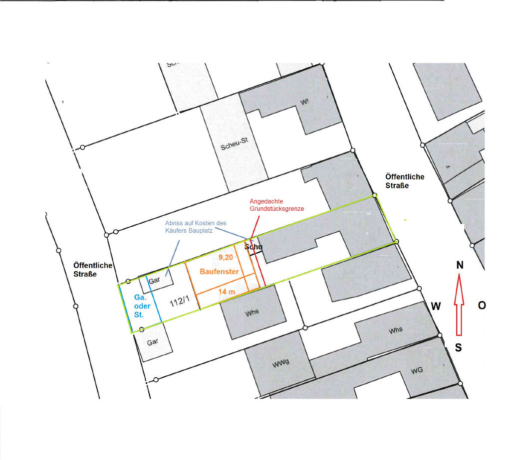 Die restliche Fläche ist abgesehen von einer Garage und einem kleinen, einstöckigen Baus, unbebaut und gerodet. Je nach Ihren Wünschen und Vorstellungen können Sie den dahinterliegenden Bereich weiterhin als Garten verwenden oder Sie nutzen Ihn zur Bebauung eines weiteren Hauses. Wie ersichtlich würden bei einem Neubau das zukünftige Gebäude und die Garage an das auf der rechten Seite bereits neu errichtete Bauprojekt anschließen. Dieser Teil des Grundstücks beträgt ca. 232 m². Das darauf befindliche Baufenster für das Wohngebäude umfasst eine Größe von 14,00 m x 9,5 m und kann mit einer Reihenhauseinheit bebaut werden. Garagen und Stellplätze müssen in einem eigene, zur Straße hin gelegen Fenster, untergebracht werden. Hierzu müssen Sie mit 1,5 Stellplätzen kalkulieren. Unter Berücksichtigung der Abstandflächen können Sie eine Grundfläche pro Geschoss zwischen ca. 81,00 und 104,50 m² rechnen. Dies müsste jedoch durch einen Architekten geprüften werden. Für weitere Details stellen wir Ihnen gerne den dazu gehörigen B-Plan zur Verfügung. Baujahr: 1925 Baujahr des Vordergebäudes