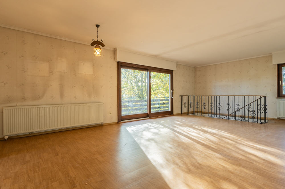 Zustand und Ausstattung entsprechen nicht mehr dem heutigen Standard – eine umfassende Modernisierung bietet hier die Chance, ein echtes Wohnjuwel nach Ihren individuellen Vorstellungen zu schaffen. Bereits der Eingangsbereich empfängt Sie mit Großzügigkeit und einem offenen Ambiente. Von hier aus gelangen Sie in den Wohn- und Essbereich, der Zugang zu einem sonnigen Balkon bietet. Dieser lädt mit seinem herrlichen Ausblick über das Grundstück und die umliegende Natur zum Verweilen ein.