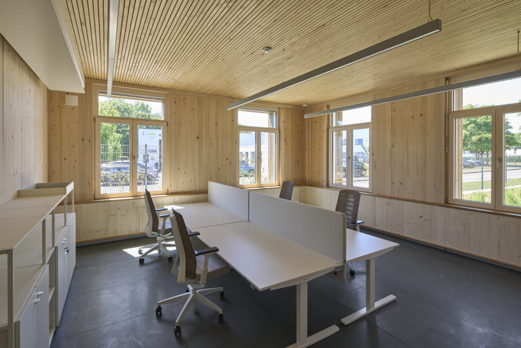 Die Innenräume bieten eine angenehme Arbeitsatmosphäre mit natürlicher Holzoptik, bodentiefen Fenstern, strukturierter Netzwerkverkabelung und LED-Beleuchtung. Die Außenwirkung des Gebäudes wird durch eine markante Holzfassade, eine Photovoltaikanlage und ein gepflegtes Umfeld ergänzt.