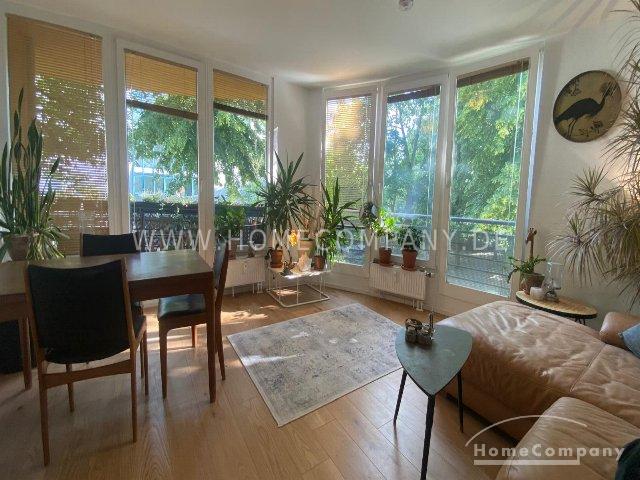 Helles Wohnzimmer mit großen Fenstern und Zugang zur großen Terrasse. Blick in den Quartier-Garten/Park. Zwei möblierte Schlafzimmer (inkl. Schreibtisch), ein Schlafzimmer hat auch Zugang zur Terrasse. Bad mit Badewanne. Waschmaschine in der Wohnung. Die Wohnung liegt am ruhigen Innenhof.