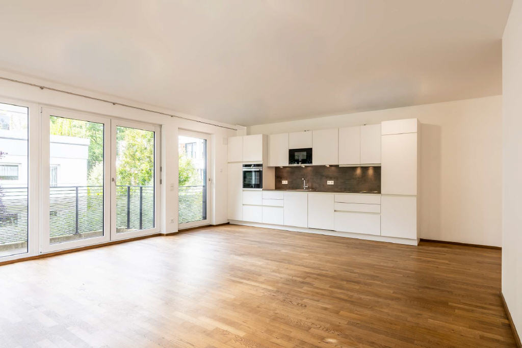 Alle Fenster sind bodentief und lassen die Räume hell und großzügig wirken. Das Herzstück bildet der große Wohn- und Essbereich mit offener Küche. Hier sorgen die hochwertigen Siemens-Einbaugeräte für höchsten Kochkomfort. Der anschließende ruhige Balkon mit Blick ins Grüne lädt zu entspannten Stunden im Freien ein.