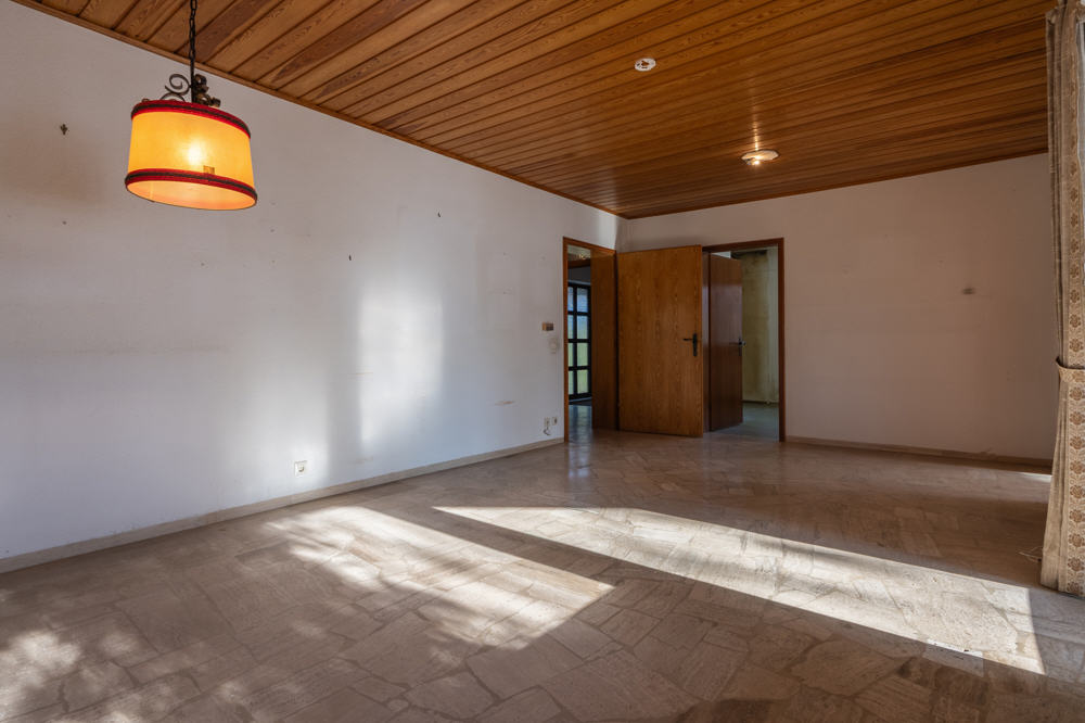 Betritt man die Immobilie erreicht man einen Windfang, welcher in eine große Wohndiele bzw. Flur mündet. Der Hauptwohnbereich besteht aus der großzügigen Wohndiele mit Ausgang auf Terrasse und Garten, sowie dem Wohnzimmer und danebenliegender Küche. Hier ist zu prüfen, inwieweit man durch Entfernen von Wänden mehr Großzügigkeit schafft. Auch das Elternschlafzimmer besitzt einen direkten Ausgang auf die Terrasse und den Garten. Es gibt 3 Kinderzimmer mit 9, 10 bzw. 11 m², sowie einen Hausarbeitsraum, Bad und Dusche, sowie separates WC. Das Haus ist unterkellert. Ein fast 40 m² großer Hobbyraum verfügt über Tageslicht, weiter verschiedene Kellerräume, Waschküche und der Heizraum.