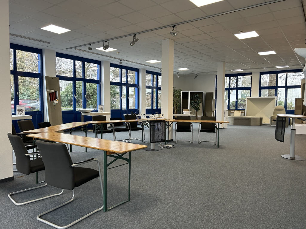 Zwei einzelne Büroräume als Empfang o.ä., ein Großraumbüro/Ausstellungsfläche, moderne Damen und Herren-WCs, Küche inkl. Einbauküche, großer Besprechungsraum und Foyer.