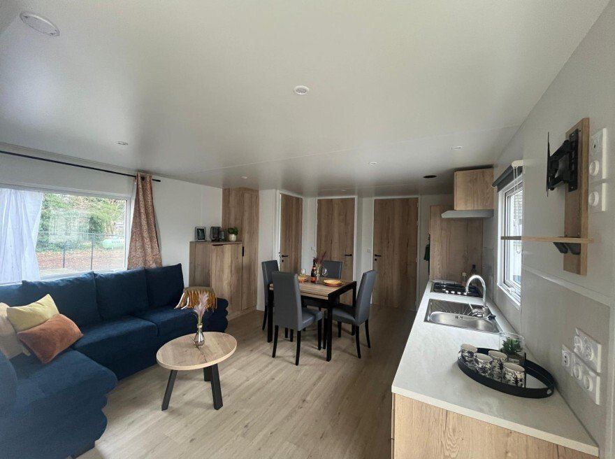 Ein exklusives Modell, speziell entworfen für Menschen mit Behinderung. Ausstattung: WOHNZIMMER Elektrische Heizung 1000 W Ausziehbares Schlafsofa Passender Couchtisch Besen-/Abstellschrank Wandregale Mechanische Lüftung Rauchmelder mit Batteriebetrieb Elektrischer Boiler 90 L Separates WC Garderobenschrank KÜCHE Elite-Edelstahlkühlschrank mit Gefrierfach Elektrischer Backofen Elektrischer Herd Dunstabzugshaube Geschirrspüler Tisch mit 4 Beinen und Verlängerungsplatte BADEZIMMER Duschkabine für Menschen mit Behinderung Hängendes WC 3 L/6 L Handtuchheizkörper HAUPTSCHLAFZIMMER Extra großes Zimmer zur optionalen Nutzung Vorhänge für Fenster inkl. Verdunkelung und Insektenschutz Bett 140 x 190 cm Elektrische Heizung 1000 W Eingebaute doppelte Kleiderschränke Vorhänge für Fenster inkl. Verdunkelung und Insektenschutz 2 Betten 80 x 190 cm Platzsparend durch ausziehbares Bett Bitte beachten: Der Preis versteht sich ohne Terrassen- und Gartenmöbel.